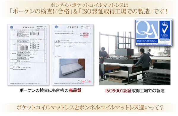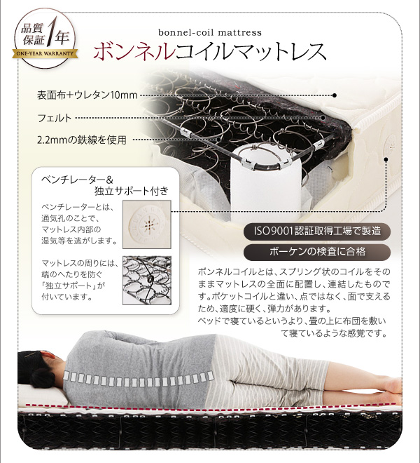 【材質】2.2mmボンネルコイルスプリング(コイル数:288)、ウレタンフォーム、ポリエステル100%張り地、両面多針キルティング加工