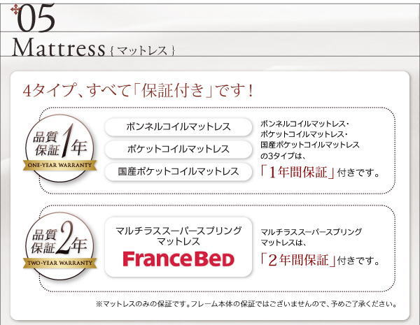 中材:マルチラススプリング(コイル数:810個)、パームパッド、ウレタンフォーム、フェルト、不織布(防虫加工)