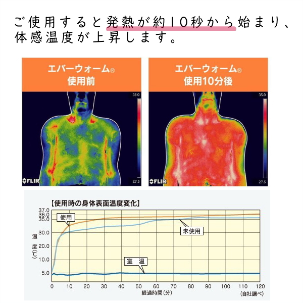 ご使用と同時に、発熱特殊パウダーが吸湿活動を開始し、発熱が約10秒ぐらいから始まり、体感温度が上昇します。