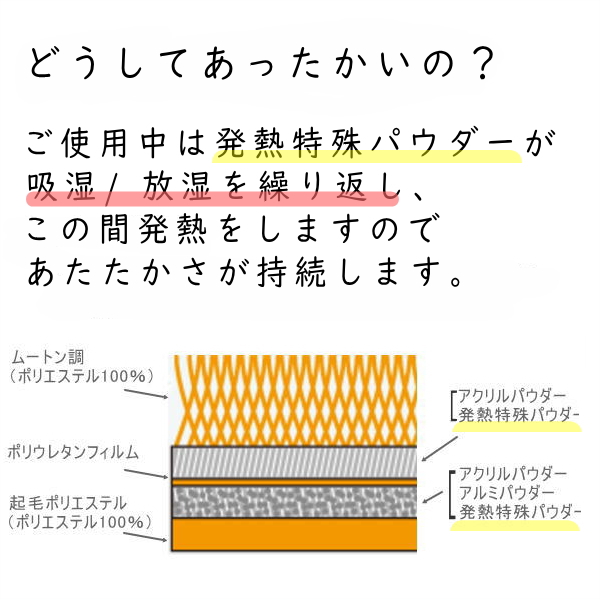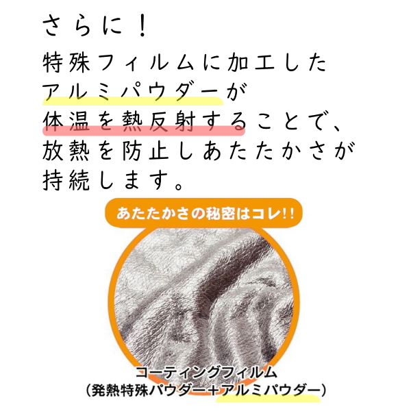 特殊フィルムに加工したアルミパウダーが体温を熱反射することで、放熱を防止しあたたかさが持続します。